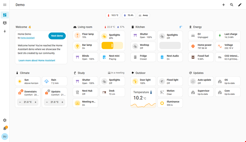 - Unterstützt über tausend Marken und mehr als 2000 Integrationen (Licht, Sensoren, Heizung, Medien, Kameras, Dienste wie Alexa/Google Assistant usw.).