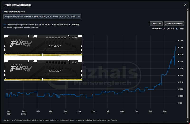 auch in europa ist die preiswelle mittlerweile angekommen. ein standard-ddr5-kit mit 16 gigabyte (gb), das im sommer noch für rund 50 euro zu haben war, kostet bei seriösen händlern mittlerweile fast durchgehend über 100 euro. wer 32 gb für einen modernen desktop-pc benötigt, muss mit mindestens 200 euro rechnen – tendenz stark steigend. günstigere angebote finden sich fast nur noch bei dubiosen marktplatz-händlern mit monatelangen lieferzeiten. auf geizhals kann man die preisentwicklung nachverfolgen. zwei ram-riegel (kingston fury beast ddr5) kosteten ende oktober rund 130 euro. stand ende november sind es 246 euro.